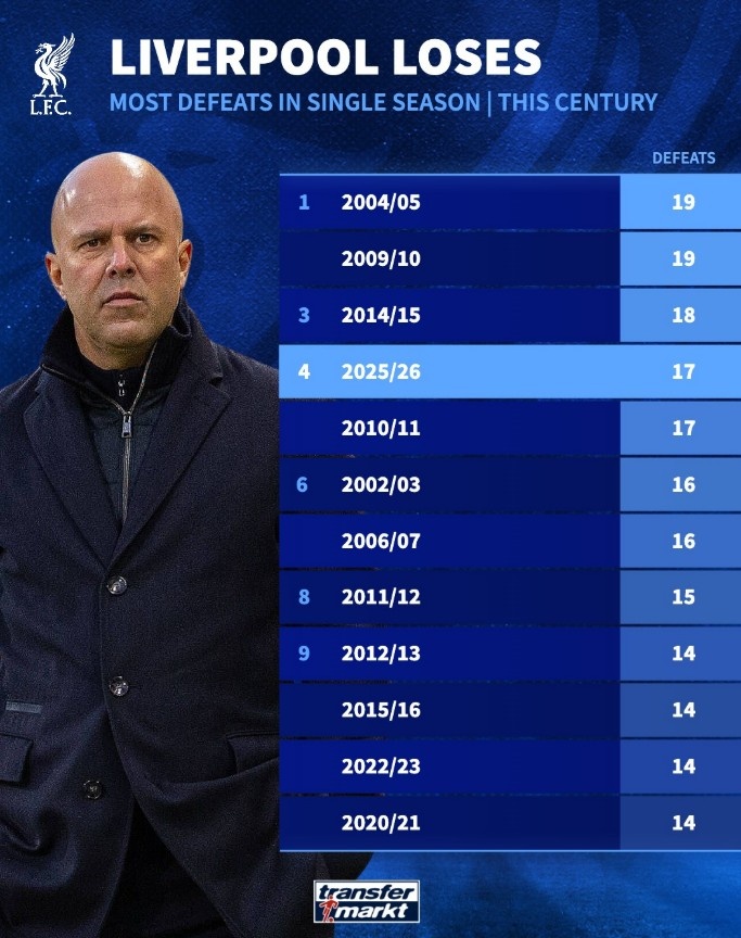 4月9日讯 在欧冠淘汰赛首回合,利物浦0-2不敌巴黎。这是利物浦本赛季各项赛事第17场失利,以下为利物浦本世纪单赛季输球场次榜: